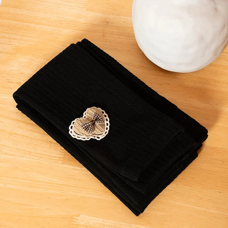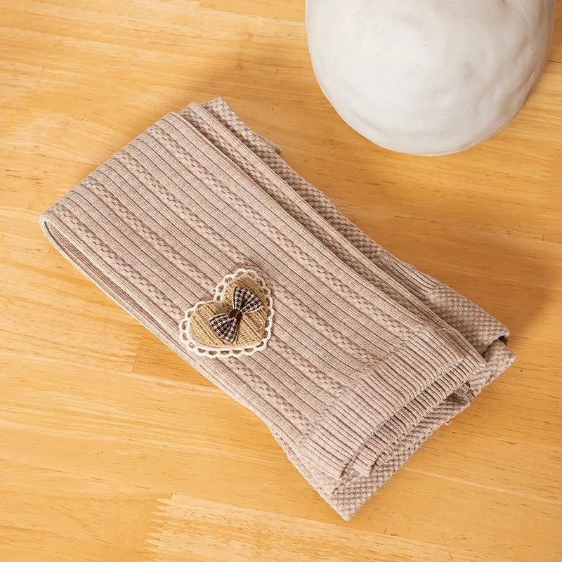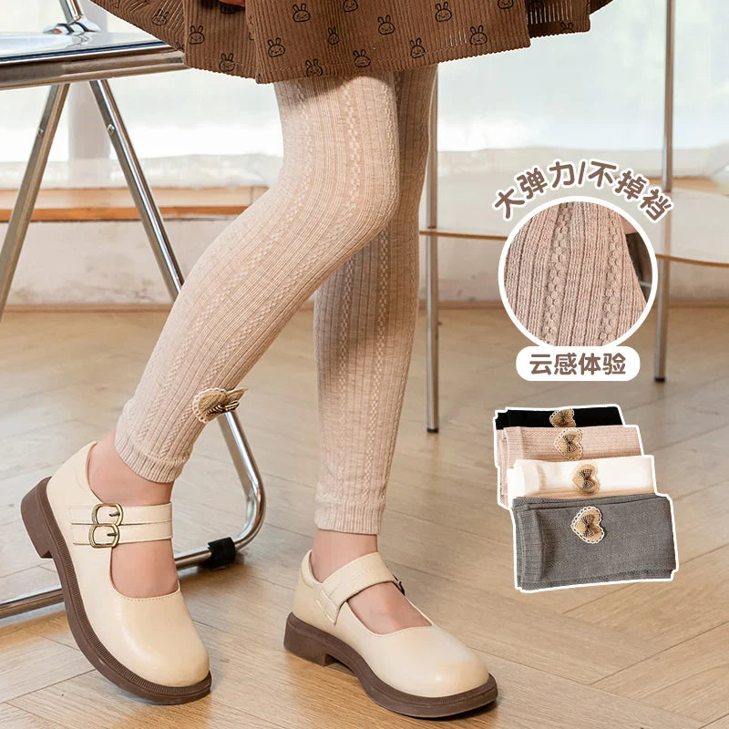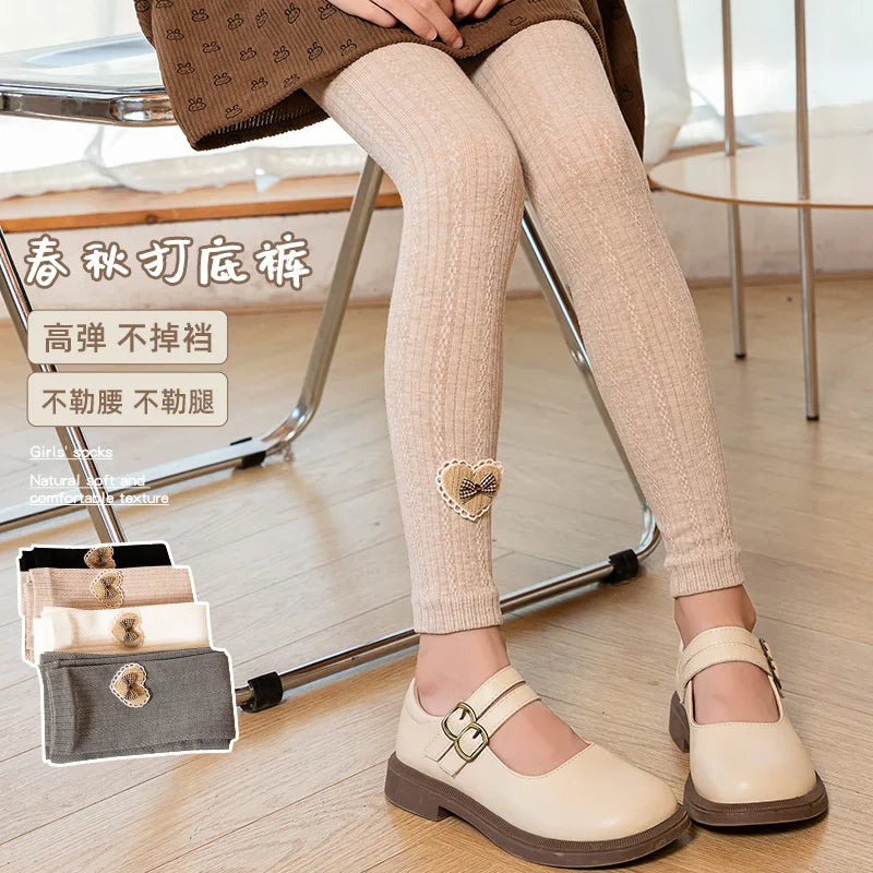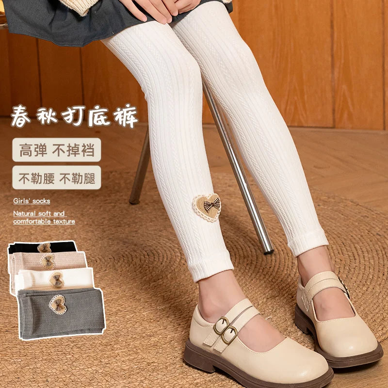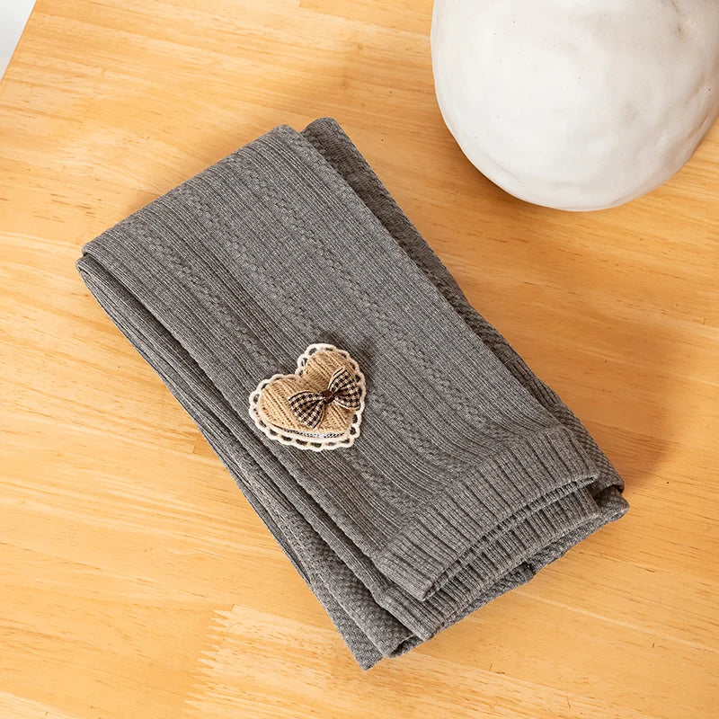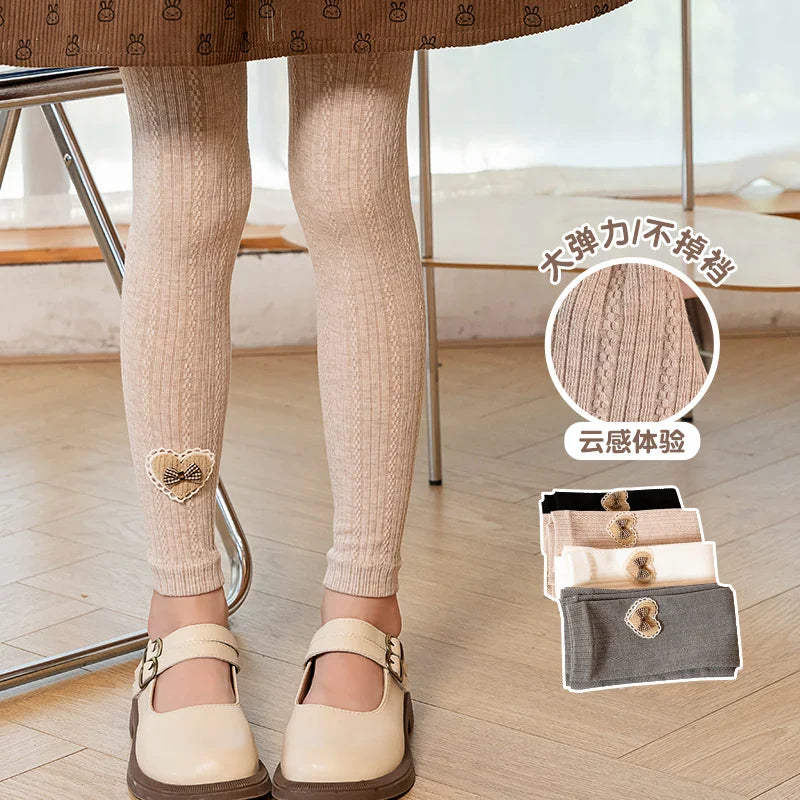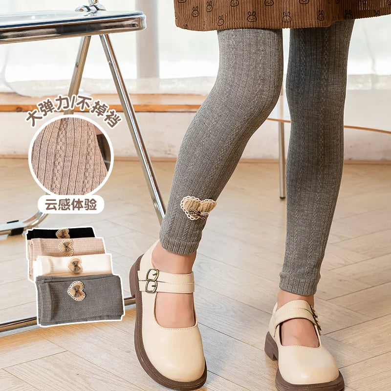 Princess Girl Wavy Cable Knit Cropped Pants With Side Love Bow Heart Lace Trim Tight Soft Comfortable Student Baby Kids Leggings