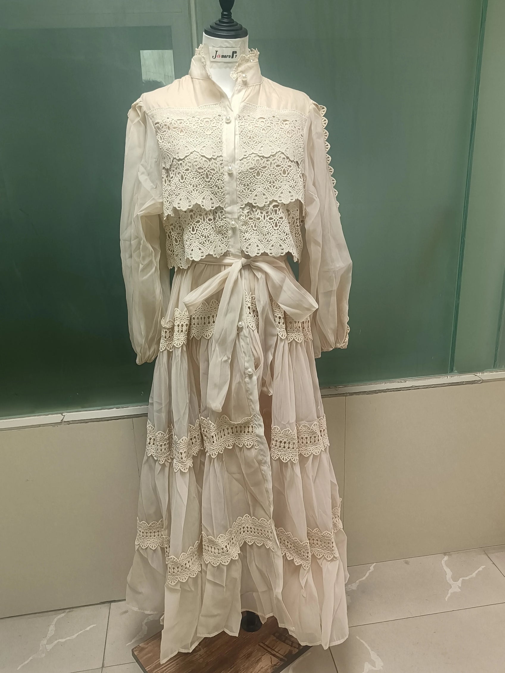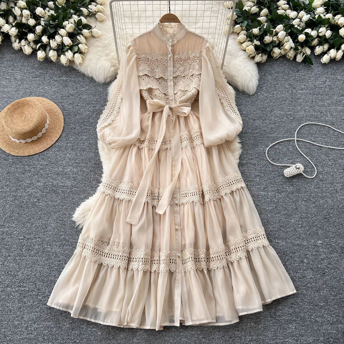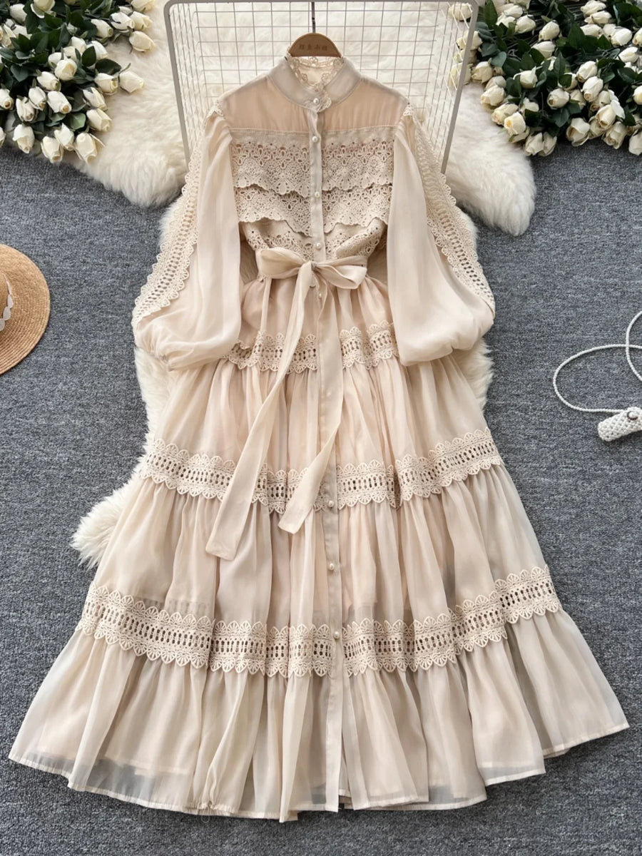 Elegant Hollow Out Organza Long Maxi Dresses Shirt Women Spring Summer Layer Ruffle Full Sleeve Pearl Evening Party Vestidos