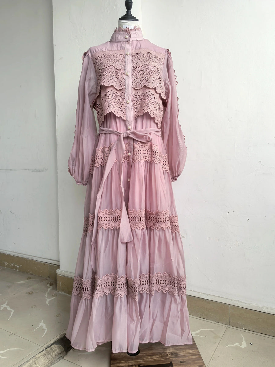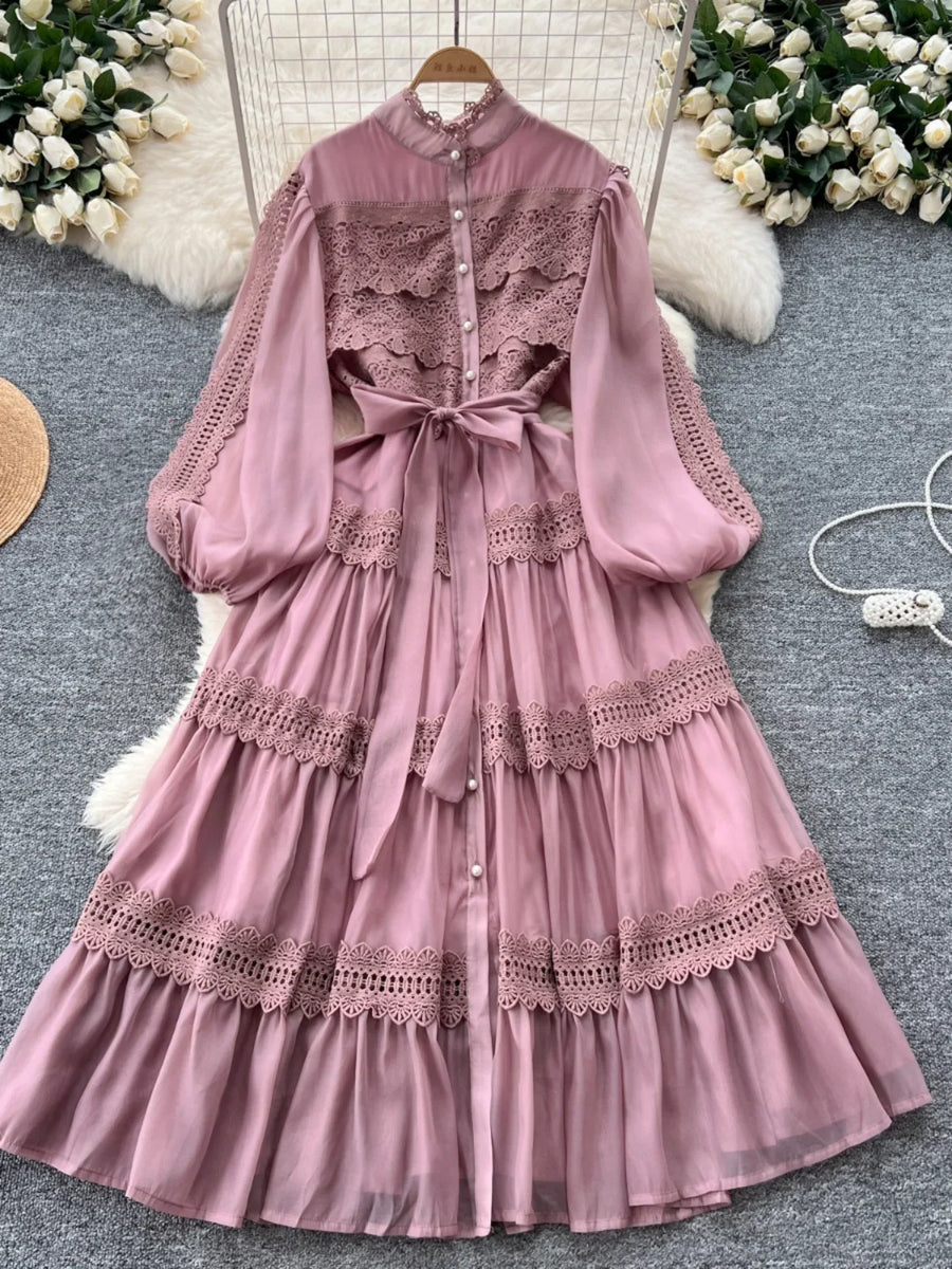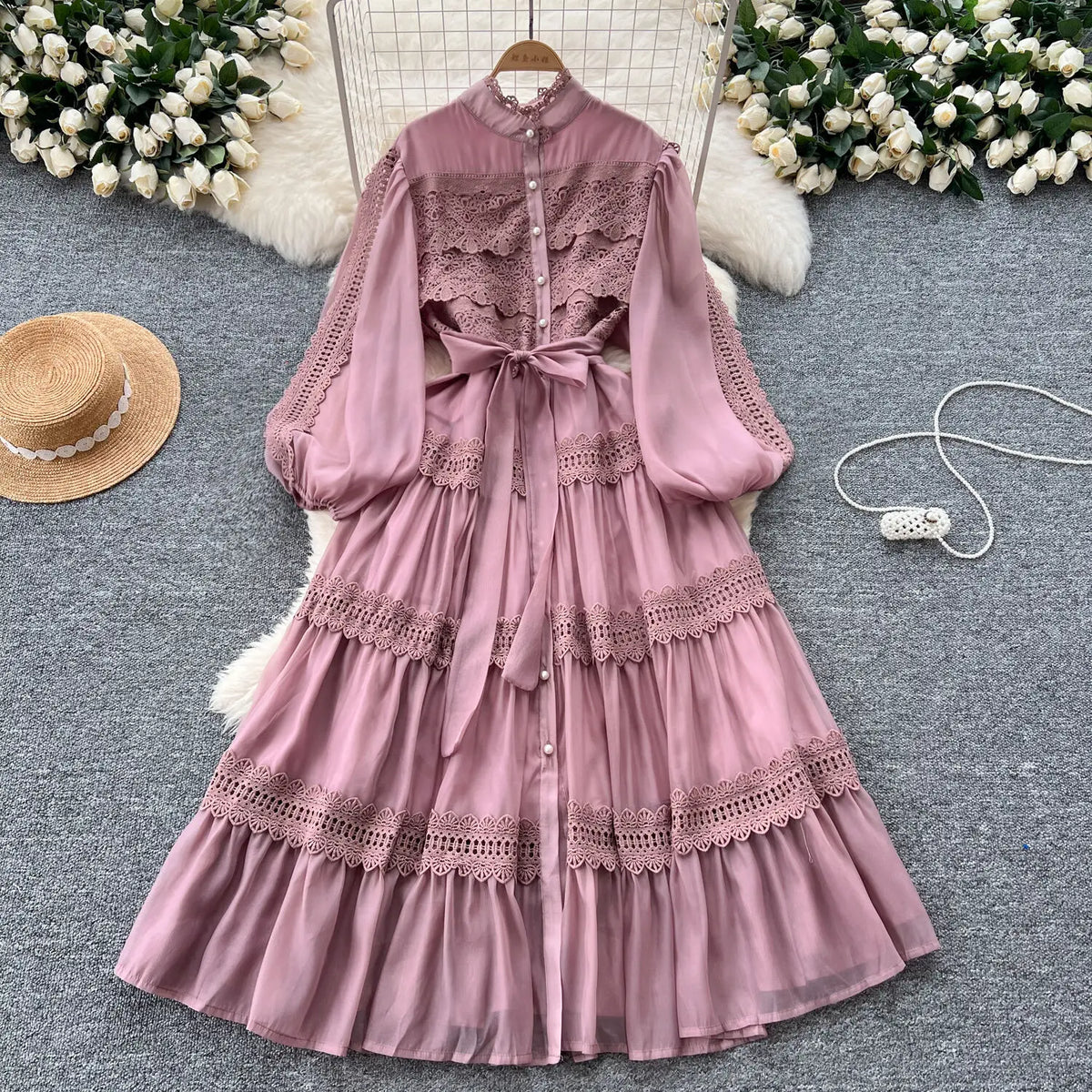 Elegant Hollow Out Organza Long Maxi Dresses Shirt Women Spring Summer Layer Ruffle Full Sleeve Pearl Evening Party Vestidos