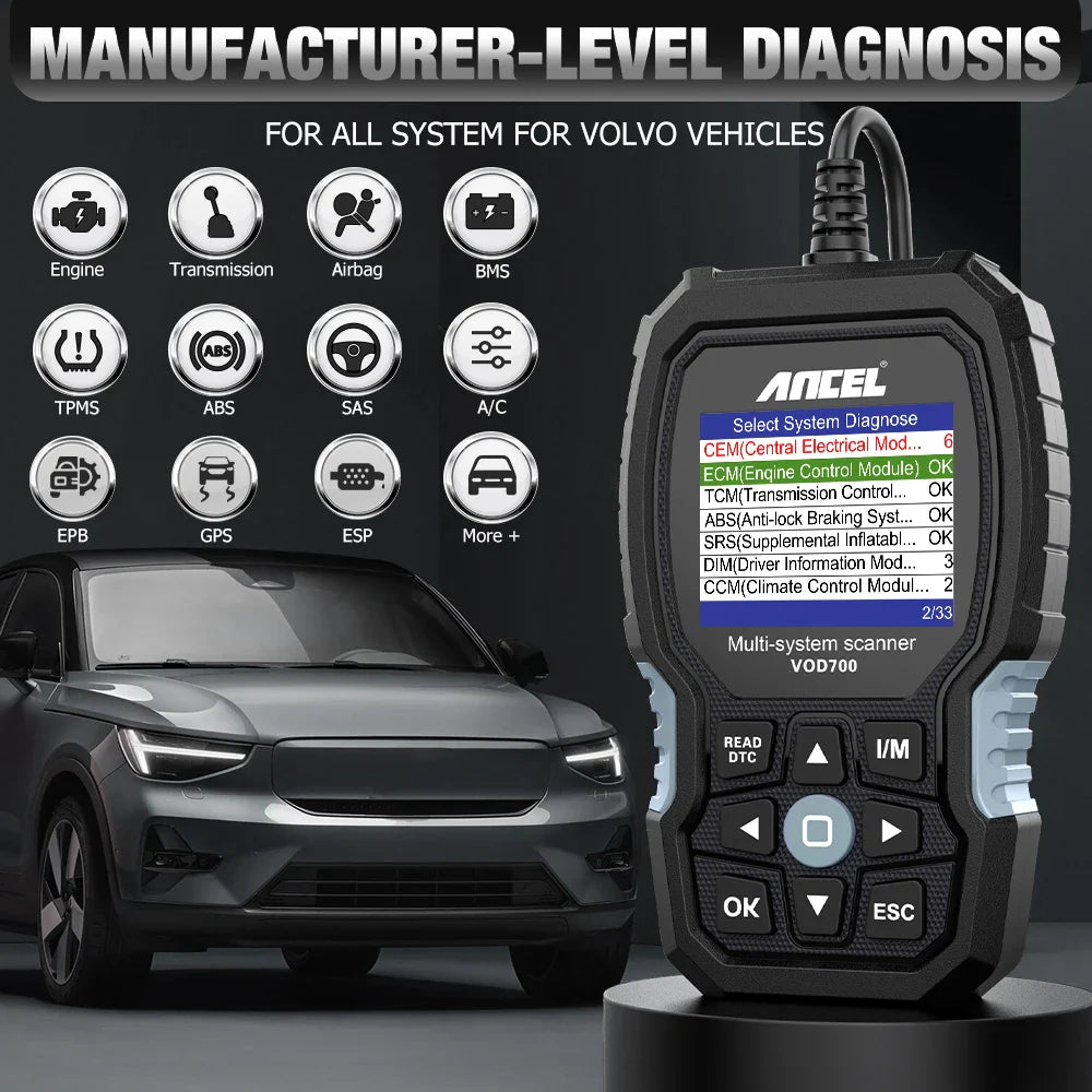 All System OBD2 Scanner Fits for Volvo Car Code Reader ABS Bleeding Injector Oil Reset OBD2 Diagnostic Scan Tool ANCEL VOD700