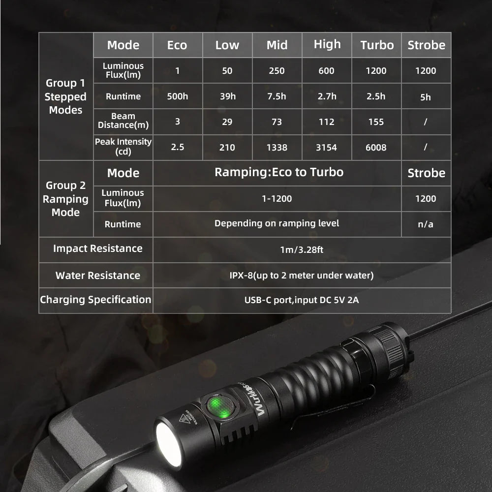 Wurkkos FC11C Wurkkos FC11C Nichia 519A Buck Circuit Camping 18650 Flashlight Max ouput 1200Lumens Magnetic Tail USB C Rechargeable EDC Torch Specifications Emitter: 1x Nichia 519A 5000KReflector: Orange Peel reflectorDriver: Buck circuit (FC11C)Operating voltage:2.7V-4.2VBattery options: 1x 18650 Li-lon batteryDimension:116.23mm (length) x 27mm (head diameter)Weight: 65 ±1 gram (without battery)Flashlight body:...