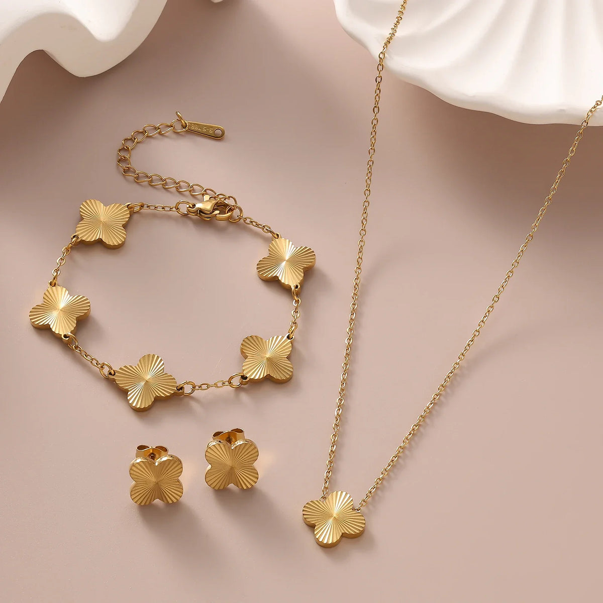 Fashionable stainless steel hand polished clover flower bracelet necklace earring set