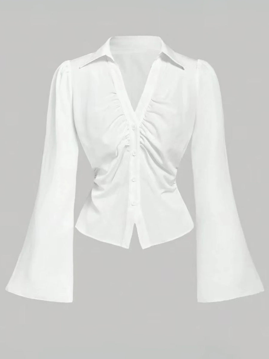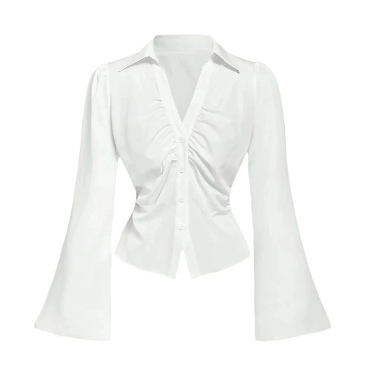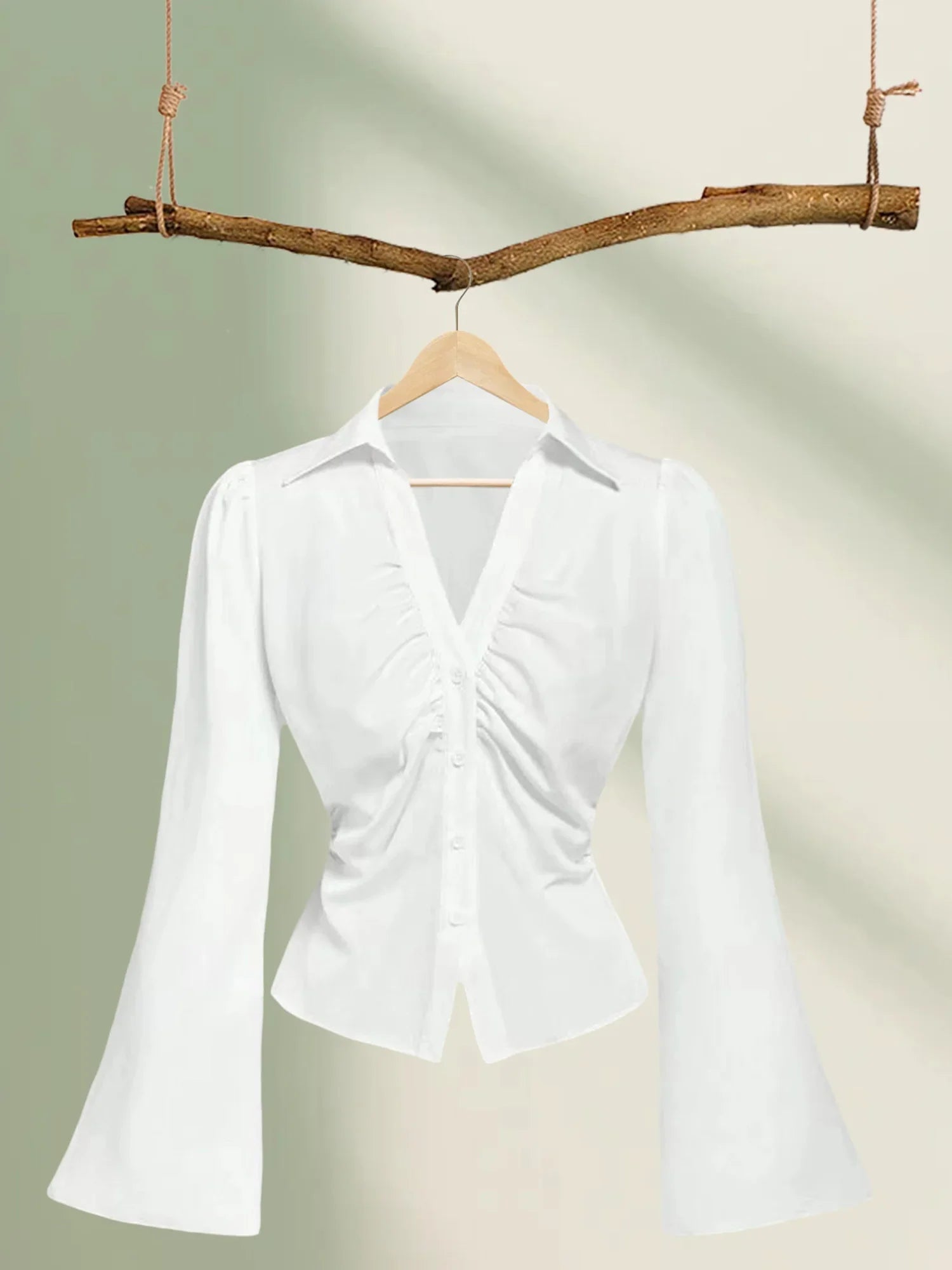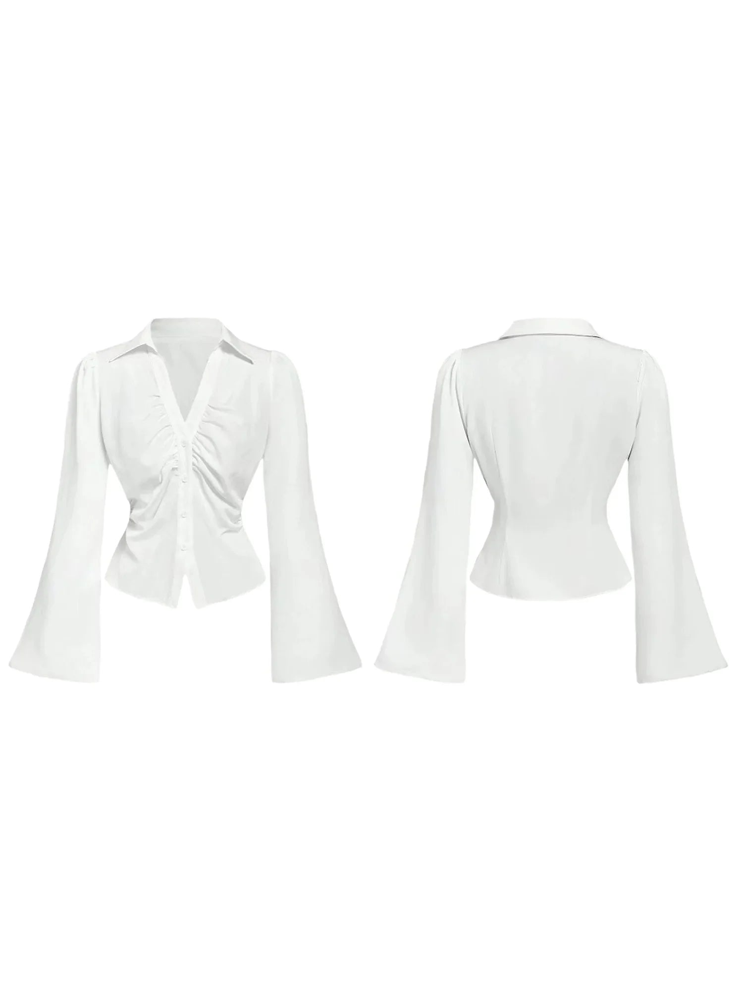 Women s Elegant Ruffle Sleeve Blouse Solid Color Lapel V-Neck Button Down Casual Shirt Spring Fall Fashion Tops